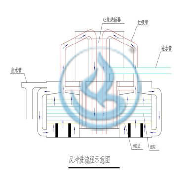 源水通過濾層,水中雜質(zhì)被攔截積累起來,濾層阻力增大,造成水位上升,當(dāng)水位上升到一定高度時,此時水通過一輔助虹吸管,整個系統(tǒng)形成自動虹吸,設(shè)備反沖洗開始,通過自動定時裝置,沖洗歷時2.5分鐘即可達(dá)到反沖洗效果。所以反沖洗工作周期取決于水質(zhì),沖洗周期可由數(shù)小時到數(shù)月。