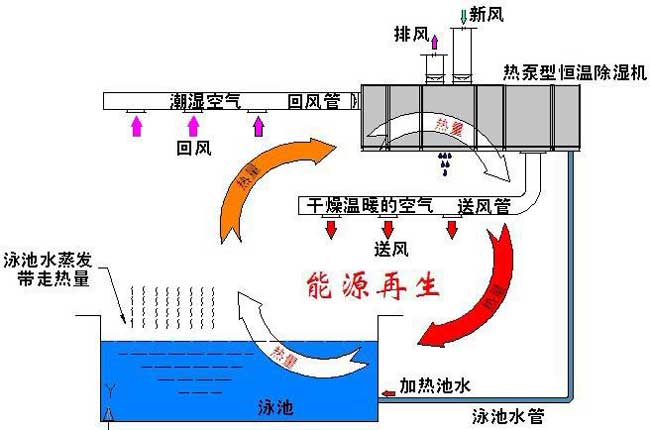 由于上面提到的這些問題,目前在市面上興起很多專門針對室內(nèi)泳池開發(fā)的恒溫恒濕熱泵。一種為常規(guī)的空氣源熱泵,只提供池水的加熱,還有一種能將除濕、空調(diào)、加熱等功能集合于一體,其工作原理簡言之,即是將池水表面蒸發(fā)熱損(包括濕熱和潛熱)回收利用,轉(zhuǎn)移入池水和空氣中,彌補池水和空氣熱損,同時實現(xiàn)空氣調(diào)節(jié)除濕功能,當(dāng)春秋的過渡季節(jié)時,(空氣溫度在15℃~26℃,相對濕度小于60%),設(shè)備運行全新風(fēng)模式,此時,只有熱泵的通風(fēng)機在工作,這種狀態(tài)下,熱泵的技能優(yōu)勢是顯而易見的。但在冬季,除濕熱泵的運用卻面臨制熱不足的問題。