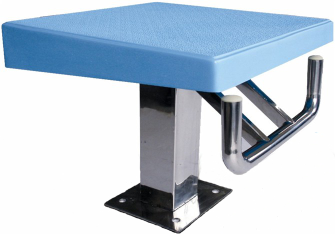 跳臺(tái)為游泳比賽專用出發(fā)臺(tái)符合游泳比賽標(biāo)準(zhǔn),為一級(jí)出發(fā)臺(tái),出發(fā)臺(tái)面為玻璃鋼材質(zhì),表面有防滑材料。顏色為淺藍(lán)色,和泳池水的顏色非常接近,非常美觀。底座為304不銹鋼,比傳統(tǒng)出發(fā)臺(tái)更具耐腐蝕性。