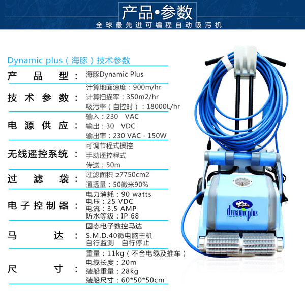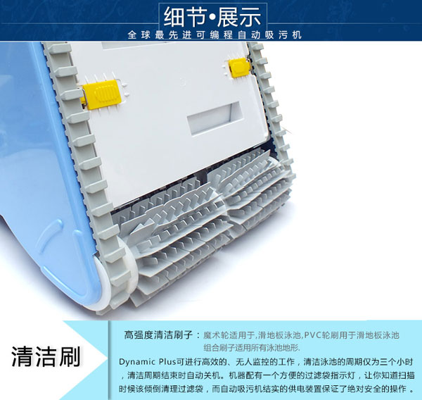 20米帶線長,帶推車,帶24V直流電變壓器,帶遙控器,爬墻智能型,電纜帶防糾纏器,變壓器帶過載指示燈,主機(jī)帶記憶芯片,遙控器帶遍程功能。20米線長,全智能帶無線遙控器,能爬墻,可在無人看管的情況下對游泳池底部及池壁進(jìn)行徹底刷洗,電纜帶萬向節(jié)可防電線纏繞,適用于長度為20米至30米的泳池。